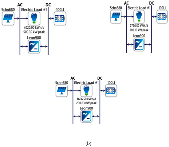 The proposed modeling configurations are based on a typical community load of electric vehicle stations (4000–500 kW peak, 4020 kWh/d; 300 kW, 2776 kWh/d; and 200 kW, 1666 kWh/d) powered by a PV system (Schn680, HOMER® Grid software, version 1.10.1 June 2023) connected to an AC bus. An ESS (100 kWh nominal capacity) is used to provide electrical power when the PV system’s output is insufficient (due to maintenance issues or the PV system not producing enough energy), and a DC/AC converter (Leonics 900 kW) is used to transfer power between the DC and AC buses. The project schematic is displayed in Figure 4. This equipment was considered in our work based on the best practices in similar projects conducted in this field worldwide [14,15,16,17,18,19,20].