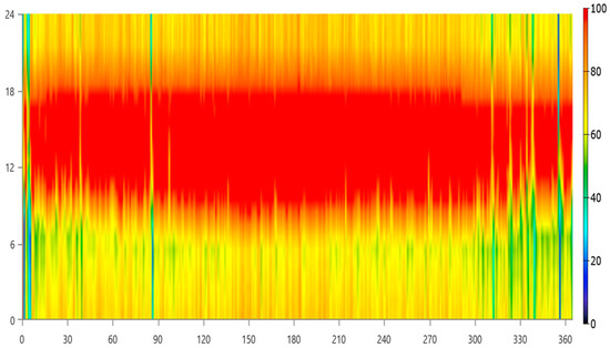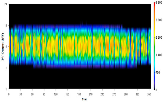 The output of the solar panels is shown in kilowatts (kW). The solar power system may produce a maximum of 24 kW, as indicated by the values, which range from 0 to 24 kW. A year’s worth of time is represented by the horizontal axis, which spans 360 days. The output of the solar power system seemed to change over time. There were times during the year when solar production was low (blue), such as at night or during the winter. The yellow and red regions had a stronger solar output; these could represent daytime or summertime, as shown in Figure 5. For 500 kW, the system’s total cost-effectiveness can be evaluated by comparing its levelized cost of electricity, which stands at USD 0.117 per kWh, to alternative energy sources or grid power rates in order to determine its financial feasibility. The PV penetration rate of 422% indicates that the solar PV system is disproportionately large in relation to the need for EV charging, which could result in a substantial surplus of power generation that could be utilized for other purposes or sold to the grid. The system’s steady and dependable performance was also demonstrated by its 4370 annual hours of operation; it ran for a substantial portion of the year in order to satisfy the needs of EV charging.