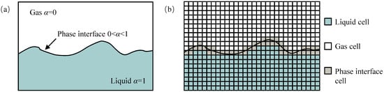 (a) Phase fraction interface in the VOF model; (b) cell type of the computational region.