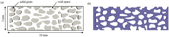 Berea sandstone and Fontainebleau sandstone serve as two frequently adopted models in the field of porous media and are extensively utilized for investigating fluid flow behaviors within such media. The primary differentiations between these models reside in their respective porosities and permeabilities. Tailored to specific research goals, the Berea sandstone model is predominantly employed to examine the flow dynamics of hydrocarbons within porous media. Conversely, the Fontainebleau sandstone model is favored for studies concerning carbon dioxide sequestration and nuclear waste disposal. For the purposes of this study, data from the standard Berea sandstone model have been selected; CINEMA 4D-R17 professional modeling software was used to build a 10 mm × 3 mm model of porous media, as shown in Figure 2a. The gray areas depict solid particles and the white areas depict flow channels. A structured hexahedral mesh is generated for the pore medium model using the snappyHexMesh toolbox in OpenFOAM, as shown in Figure 2b. The left side of the model is designated as the inlet, the right side is the outlet, and the solid particles are the walls. The inlet and outlet and wall boundary conditions are set as shown in Table 1. The pore walls were subjected to complete wetting conditions, and the Coulomb number C0 was set to 0.3 with a fixed time step. The values of the fluid parameters and computational parameters in the model are listed in Table 2, and the gas phase properties use the same parameters as for methane gas.