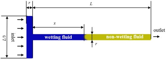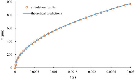 To validate the accuracy of the VOF model calculations, a microscale capillary model, as depicted in Figure 3, was established to simulate the position of the gas–liquid interface during the capillary action. The accuracy and applicability of the numerical simulation method were verified by comparing the simulation results with the theoretical solutions of classical capillary. Neglecting gravity and inertia forces, the two-phase interface position is determined by the capillary force and viscous force, and its mathematical expression is as follows [25]:
