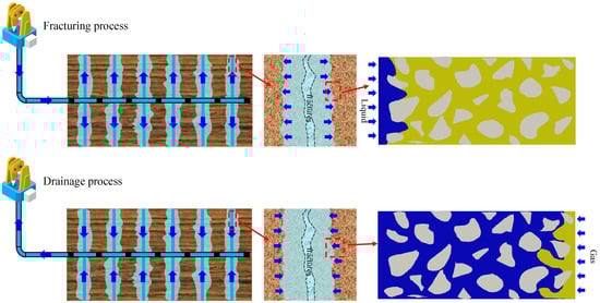 Fracturing horizontal wells for the hydraulic fracturing and rejection process is a typical gas–liquid two-phase flow process, as shown in Figure 5. The fracturing fluid is pumped into the horizontal well through the surface high-pressure sink and filtered out to the reservoir through the hydraulic fracture; the fluid invades the reservoir matrix pore space under the actions of pumping pressure and capillary force to drive out the gas stored in the pore space. After hydraulic fracturing, the well is opened and the fracturing fluid is returned to the reservoir; the gas in the reservoir repels the fluid due to the production pressure difference, forming a gas flow channel and replacing some of the intruded fluid in the matrix pores. Using the porous media model established in Figure 2, the microscopic flow characteristics of the two stages of fracturing and re-discharge are simulated with the calculated parameters in Table 1 and Table 2 to study the effects of two types of fluids, Newtonian fluid water and non-Newtonian fluid slickwater, on gas flow.
