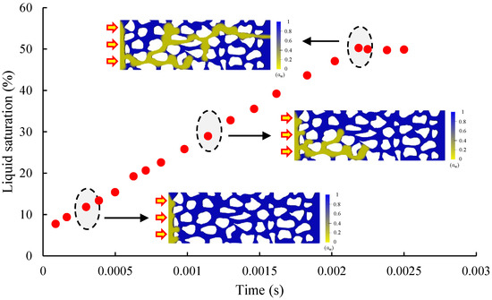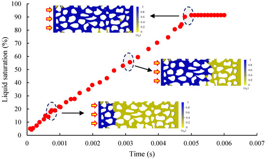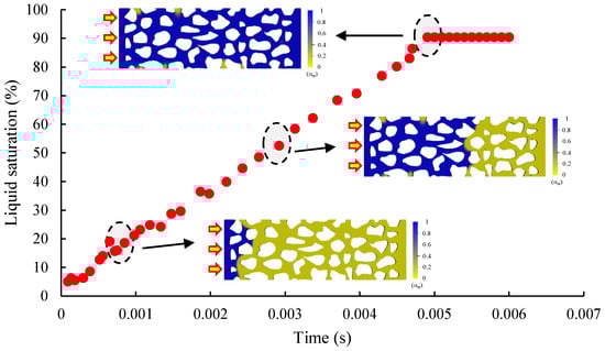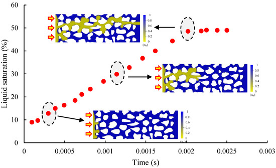 Figure 6 illustrates the evolution of liquid-phase saturation as water intrudes into the porous medium, displacing the gas. With the injection of water, due to the additional capillary force, the water phase breaks through the small pore size preferentially, and the liquid-phase saturation in the porous medium gradually increases; the increasing relationship between saturation and time is nearly linear. When the water phase breaks through, the liquid-phase saturation reaches a maximum value of 90.42% and remains stable. The gas that could not be displaced becomes primarily concentrated in the dead-end regions of the porous medium. During the simulation, large bubbles were also observed splitting into two small bubbles.