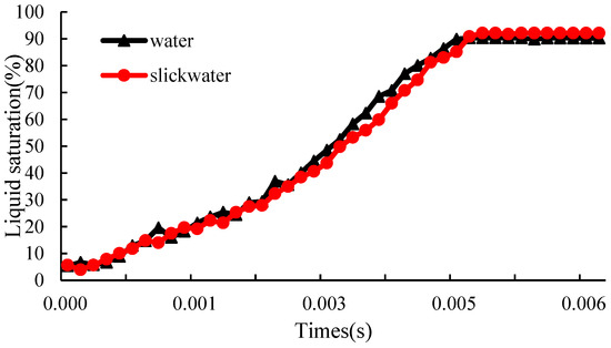 Figure 7 illustrates the variation in liquid-phase saturation during slickwater intrusion into the porous medium to repel the gas. With the injection of slickwater, the liquid-phase saturation increases linearly and reaches a maximum saturation of 91.47% by the time the liquid phase breaks through and remains stable. Comparing the simulation results depicted in Figure 6 and Figure 7, it is observed that within the time interval of 0–0.002 s, the saturation of slickwater in porous media is slightly higher than that of water, indicating that slickwater more readily enters dead-end positions during the initial stages of flow. Within the subsequent time interval of 0.002–0.005 s, the water occupies a greater proportion of the larger pores, while the slickwater displaces more gas from the dead-end regions of the porous medium. The displacement velocity of the water is marginally faster than that of the slickwater, resulting in a higher water saturation within the porous medium. The water achieves a stable flow earlier than the slickwater. Given that slickwater has a propensity to enter dead-end locations more easily, it exhibits a higher degree of gas displacement compared to water. Ultimately, upon reaching stable flow conditions, the saturation of slickwater in the porous medium is slightly higher than that of water.