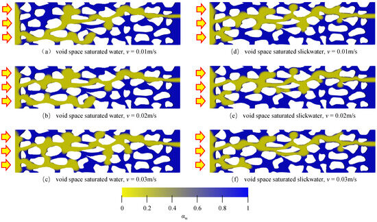 Gas wells experience frequent changes in their production regime during production, resulting in changes in fluid flow rates which are ultimately reflected as changes in the daily gas production in the gas well. In simulating the effect of gas flow rate changes, three different flow rates are set, as shown in Figure 11. As the percolation velocity increases, the time for the gas to break through the porous medium decreases. Within the porous medium, the gas breaks through in the direction of the minimum seepage resistance, and after breaking through the seepage channel the gas will expand the previous seepage channel and turn to strengthen the already formed seepage channel when a new one cannot be formed.