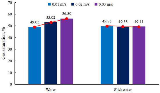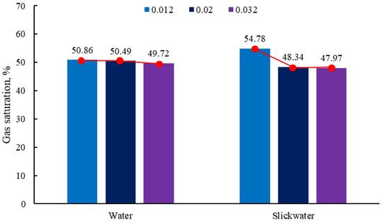 The variation in gas saturation as the gas breaks through the porous medium at different flow rates is presented in Figure 12. As the flow rate increases, gas saturation within the porous medium gradually rises, with this trend being particularly pronounced in the water phase. However, the final gas saturation in the slickwater shows little change [34]. Given that most gas wells in the field are fractured using non-Newtonian fracturing fluids, the increase in the fracturing fluid rejection rate achieved by raising the production pressure differential after re-establishing gas flow following a shut-in is not significantly noticeable [4,35,36].
