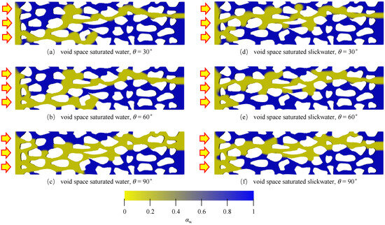 There is a role for surface tension between the interface of two immiscible fluids, the liquid phase and the gas phase. Figure 15 illustrates the flow state of a gas inside a porous medium as the surface tension increases. As the surface tension increases, the liquid becomes more capable of contracting between the phase interfaces; the force required to change the liquid phase morphology is greater, and the flow of the gas at the phase interface is more biased towards being compressed, and therefore the flow pattern is more regular; this change is more pronounced at the gas edges [38]. In slippery water, as the surface tension decreases, the Haynes step phenomenon is evident [39,40], and the gas phase is more likely to form small bubbles that snap off. A comparison of the change in the wetting angle reveals that changing the gas–liquid interaction or the solid–liquid interaction has a greater effect on the choice of gas percolation path, with the gas flowing in the aqueous phase shifting from low to high breakthrough, but preferring high for breakthrough in slippery water, a feature that does not appear in the flow velocity change study.