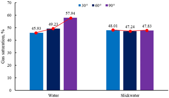 The change in gas saturation within the porous medium at the moment of gas breakthrough for various wetting angle values is presented in Figure 14. It can be seen that, with an increase in the wetting angle, the change in gas saturation in the water phase is larger; the gas-containing saturation increases by 12.01% during the process of changing the water phase from the wetting phase to the non-wetting phase. However, with an increase in the wetting angle, the change in gas saturation in slickwater is not obvious. As the pore radius of an unconventional reservoir is small, it is easy to form a “water lock effect” after contact with the liquid phase. When using a wetting reversal agent to release a water lock, we should consider the nature of the liquid phase that produces the water lock and choose an appropriate wetting reversal agent [37].