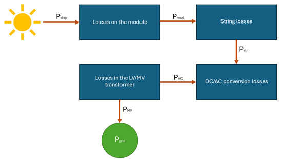 The losses are given as a percentage of the power available in Table 6, which is calculated in proportion to the incident radiation for all the general blocks shown in Figure 1.
