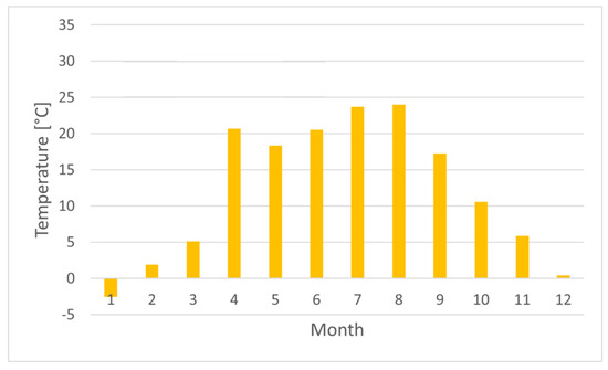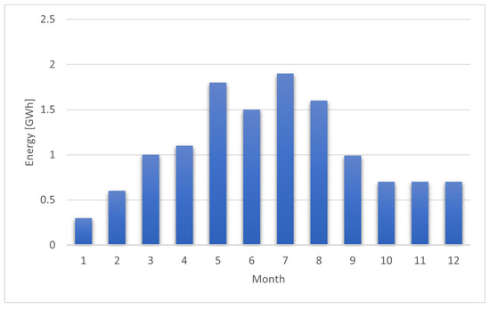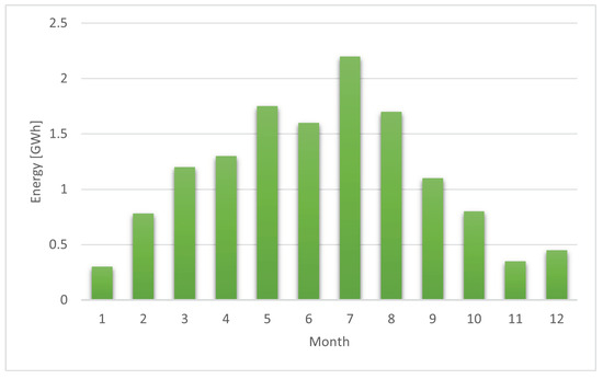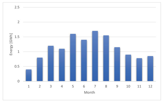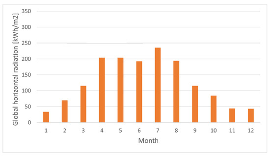 In this study, one data source was considered to estimate the output of the various configurations: Photovoltaic Geographical Information System (PVGIS). The solar radiation and temperature information provided by PVGIS is mainly calculated from satellite data. This provides information for any location over large geographical areas, with hourly temporal resolution. The graphs in Figure 2 and Figure 3 show the monthly horizontal global radiation and average temperature.
