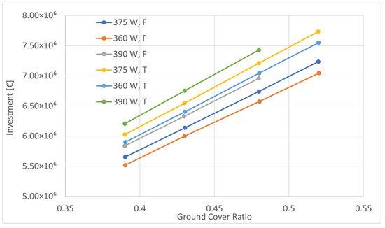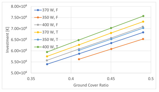 Total investment based on GCR for single-sided modules. F = fixed structure, T = tracker structure.