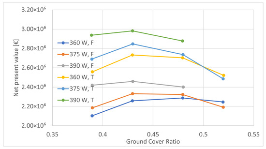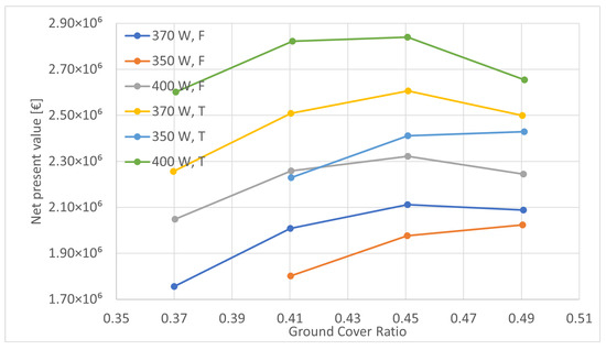 NPV as a function of GCR for double-sided modules. F = fixed structure, T = tracker structure.