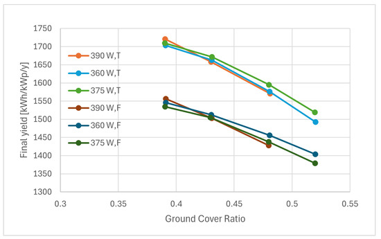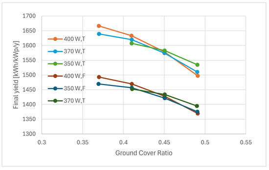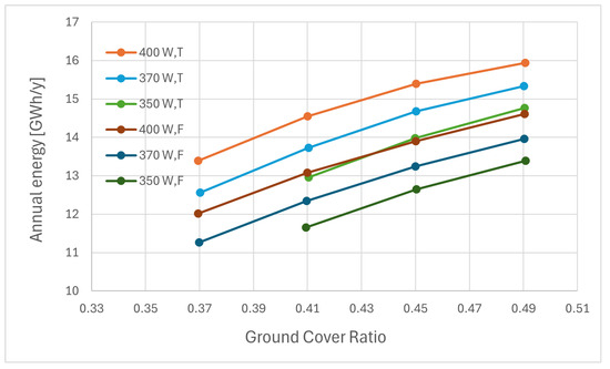 It can be observed that the gain from tracking is higher for the single-sided modules. This is due to the fact that bifacials can already benefit from a higher reference yield (Yr), due to the additional radiation received on the rear side, and also because the tracker significantly favors the front surface, thus reducing the contribution of the rear side. In general, the final yields decrease with increasing land cover and, as can be seen from the slope of the curves, the decrease is different depending on the power of the module. In fact, it can be seen that the magnitude of the variation is greater if the power of the module is higher; considering that the dimensions of the modules chosen for this study are approximately the same (gross area of approximately 21°), higher power also means higher module efficiency. This means that the more efficient modules are also those more sensitive to variations in GCR. Figure 14 and Figure 15 show the values of the annual energy produced by the same installations, from which it can be deduced that, by increasing the ground cover, and thus raising the DC/AC ratio, more energy is produced.
