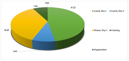 A similar concept was applied on the second conference day, where the lunch consisted of green pea cream soup, steamed fish with rice and tomato salad. Here, we also examined three energy flows for the complete preparation of the dishes: water, natural gas, and electricity. The concept of the input and output flows is identical to the concept known for the first conference lunch. The only difference is that no cooking oil was used for this menu item since the fish was prepared using sous-vide cooking technology and the percentage amounts of the generated food waste were different. Table 4 presents the energy consumption and food waste amount for lunch on the second conference day.