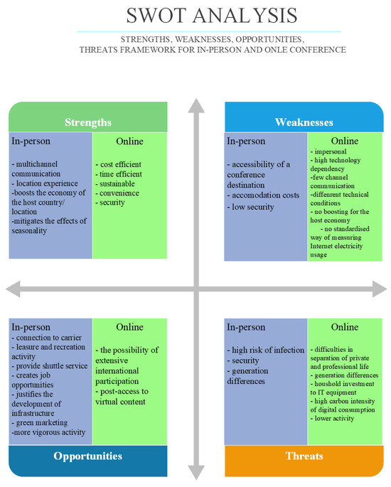 To make a conference as sustainable as possible, the main aspects to be taken into account in the different decisions are presented in the SWOT chart. It provides a clear overview of internal and external factors that can influence decision success. Figure 3 illustrates the results of the SWOT analysis after comparing the two types of conferences in four areas (strengths, weaknesses, opportunities, and threats).