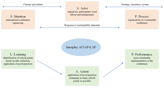 Burkhanov et al. [40] proposed a situation–actor–process and learning–action–performance model of flexible system management to support sustainable development. A SAP-LAP analysis diagram summarizes the ways to achieve the objectives and challenges identified in the SWOT analysis to illustrate our primary purpose and place for sustainability calculations. In Figure 4, the steps to achieve the set goal of organizing a sustainable conference were summarized in a SAP-LAP model.