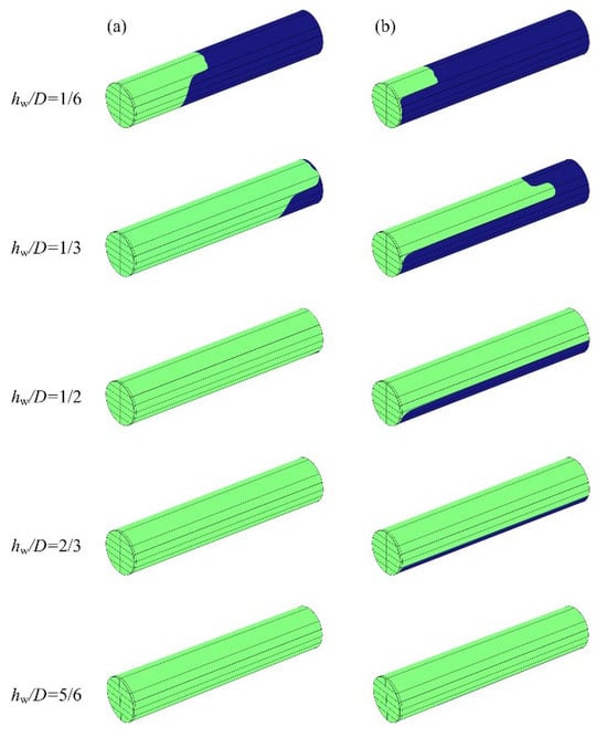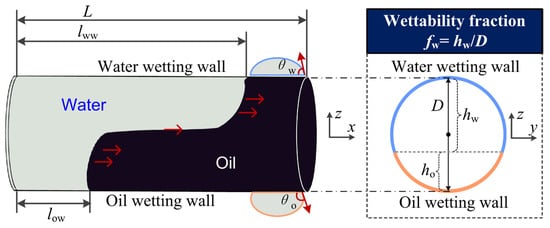 The pores in rocks are simplified as the horizontal capillary tubes with circular cross-sections of equal diameter. In previous work, a pore-scale mixed wettability model was developed to simulate the imbibition oil recovery process at the pore scale [24]. It was found that the degree of mixed wettability and its distribution have a significant relationship with the imbibition oil recovery rate. During the analysis of residual oil formation, several typical mixed wettability pore channels were identified. To investigate the imbibition behavior in these typical mixed wettability pore throats, the pores in the media are simplified as the horizontal capillary tubes with circular cross-sections of equal diameter. Although the capillary model ignores the complex morphology of real pores, the distribution of pore sizes, connectivity between pores, and irregularities, it can effectively quantify the impact of mixed wettability on the imbibition oil recovery process, thus eliminating the interference introduced by other factors such as the complexity of pore structure. The mineral constituent of a tight oil reservoir is complex and randomly distributed, resulting in the uneven distribution of rock pore surface wettability, which possibly presents different wetting fractions (i.e., water wetting height to diameter ratio, fw = hw/D) radial along the capillary tube. The mixed wetting capillary tube with a radius of 1 μm and a length of 10 μm is employed as the physical model, as shown in Figure 1. The mixed wetting capillary tube is initially filled with the oil phase. Then the water phase at the left inlet of the capillary tube is continuously imbibed to expel the existing oil phase under the effect of the spontaneous imbibition. The density and viscosity of water are 1 g/cm3 and 1 mPa·s, respectively. It is assumed that the density and viscosity of the oil phase are equal to those of the water phase. The interfacial tension of oil–water is 0.035 N/m.