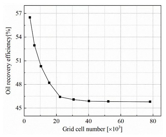 Simulations with different mesh densities are performed to evaluate the sensitivity of the results to the grid resolution. As shown in Figure 2, the simulation results of oil recovery efficiency at the calculation time of 2.31 × 10−6 s are obtained under different grid resolutions. When the grid cell number is increased to 40,278, the oil recovery efficiency is basically the same. In order to fully ensure grid quality and computational accuracy, and reduce computation time, the mesh generation scheme with this grid cell size is ultimately chosen for subsequent work.