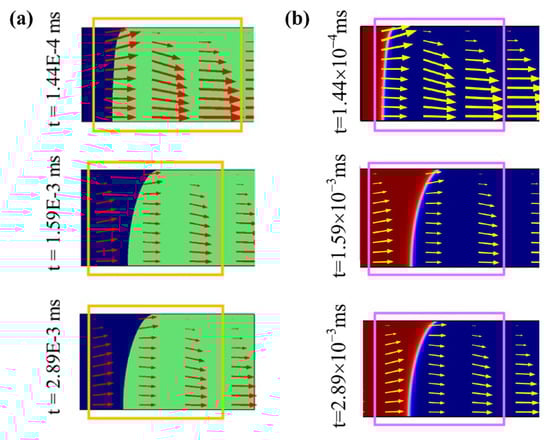 The spontaneous imbibition processes of the micro-capillary with a radius of 1 μm at different time steps when l/R is 5. The arrows denote the velocity magnitudes and directions. (a) Results in reference from Peng [37]; (b) Numerical results in this work.