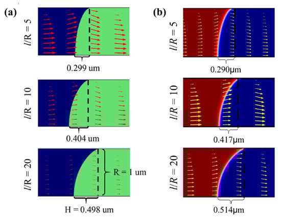 The spontaneous imbibition front widths for different l/R at 2.31 × 10−3 ms. (a) Results in reference from Peng [37]; (b) Numerical results in this work.