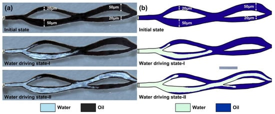 Water/oil displacement processes in microfluidic chip model. (a) Experimental result in reference [45]. (b) Numerical results in this work.