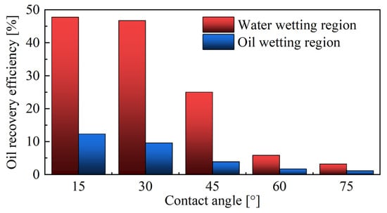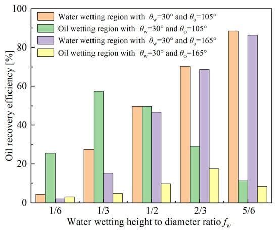 To further quantify the effect of different oil detachment modes of spontaneous imbibition, the oil recovery efficiencies in the two wetting regions of mixed wetting capillary tubes are compared, as shown in Figure 12. It can be observed that at arbitrary θw, the contribution of the water wetting region to spontaneous imbibition recovery efficiency is significantly greater than that of the oil wetting region. In addition, at a particular θo of 165°, the spontaneous imbibition oil recovery factor for both regions decreases as θw increases. Obviously, in the strong water wetting cases (i.e., the values of θw are 15°, 30°, and 45°), the water wetting region achieves a good spontaneous imbibition effect and also drives the peel-off of the partial oil in the oil wetting region, which corresponds to the wetting characteristics of the top left area enclosed by the blue line in Figure 8. However, when in weak water wetting states (i.e., the values of θw are 60° and 75°), the overall spontaneous imbibition oil recovery efficiency in both the water wetting and oil wetting regions is less than 10%, ultimately exhibiting poor spontaneous imbibition effects, which corresponds to the wetting characteristics of the top right area enclosed by the blue line in Figure 8. These phenomena can be attributed to the influence of the wall contact angle size scale.