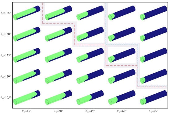 In order to further evaluate the impact of contact angle on the oil detachment mode of spontaneous imbibition, the spatial mixed wetting distribution of fw = 1/2 is selected for the investigation as it eliminates the different wettability proportion influence of oil and the water wetting wall. The contact angle at the water wetting wall ranges from 15° (i.e., strong water wetting) to 75° (i.e., weak water wetting), and is increased 15° per simulation. The contact angle at the oil wetting wall ranges from 105° (i.e., weak oil wetting) to 165° (i.e., strong oil wetting), with an increase step of 15°. The spontaneous imbibition results for different contact angle combinations at 5 × 10−5 s are shown in Figure 8. Based on the observed fluid distribution characteristics during the spontaneous imbibition, there are basically three typical oil detachment regimes of spontaneous imbibition, mapped on a θo − θw diagram in Figure 8. The approximate boundary marked with the pink dashed line is considered as the boundary between oil complete detachment and partial detachment modes. The approximate boundary marked with the blue dashed line is considered as the boundary between oil partial detachment and trace amount detachment modes. For such a small capillary tube together with a limited number of simulations, it is illogical to specify definite boundaries between different regimes, so the oil imbibition recovery regimes are distinguished by the grayish thick boundary zones to avoid errors caused by the uncertainty. The oil detachment mode, fluid flow regularity, and recovery efficiency of spontaneous imbibition in the three regions are discussed in detail below.