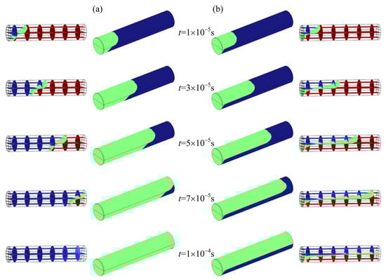 Evolution of the fluid distributions and oil–water interfaces of spontaneous imbibition for the mixed wetting capillary tube at different times. (a) Case for the mixed wetting combination of θw = 30°, θo = 105°; (b) Case for the mixed wetting combination of θw = 30°, θo = 165°.