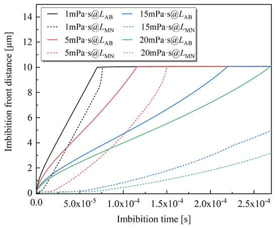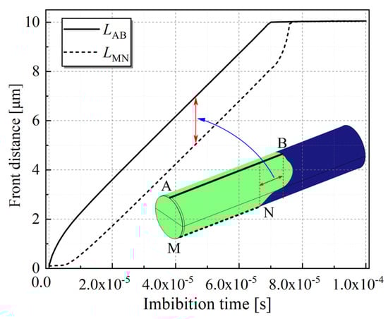 In order to further observe the dynamic changes in the spontaneous imbibition front interface in the oil complete detachment mode, the migration distance curves of the water phase front on the water wetting wall and the oil wetting wall located in the relative positions (i.e., lines AB and MN) are portrayed in Figure 10. The results indicate that the spacing between these two curves increases over time at the beginning of spontaneous imbibition. After that, the spacing between these two curves remains constant with increasing time, behaving approximately parallel until breakthrough at the outlet. Whereas the approximate constant of the spacing between these two curves is considered to be the front distance difference (ΔL), the magnitude of which is dependent on the contact angle of the mixed wetting capillary tube wall.