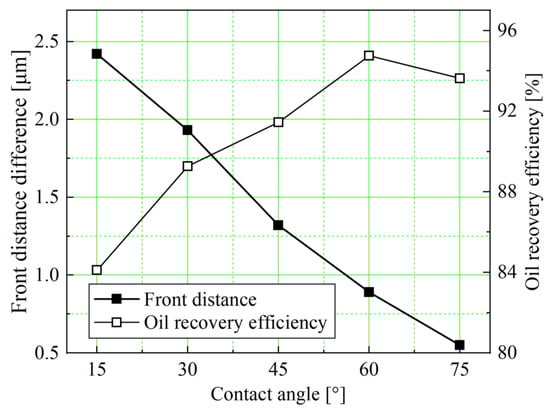 This can be confirmed in Figure 11, where the stable front distance difference values varying with the contact angle sizes are shown. The reason for selecting the value of θo = 105° is that at this point, the oil in spontaneous imbibition cases with arbitrary θw values have completely started up and front distances on the two wetting walls of the mixed wetting capillary tube change significantly over time. Furthermore, we observe that a higher water wetting contact angle leads to a reduction in the front distance difference, which is consistent with theoretical expectations. This reduction occurs because, in cases with weaker water wetting, the capillary force driving the imbibition process is weaker, resulting in a lower migration velocity of the front. This slower movement of the front translates to a significantly longer breakthrough time for the water phase in weak water wetting systems compared to those with stronger water wetting behavior. In contrast, in systems with stronger interaction between oil and water, the spontaneous imbibition process enhances oil recovery efficiency, especially at breakthrough. The analysis indicates that as the contact angle of the water wetting wall increases from 15° to 75°, the oil recovery efficiency via spontaneous imbibition improves by 9.52%. This suggests that a more pronounced water wetting behavior accelerates the displacement of oil, facilitating the recovery process. Additionally, the effect of prolonged spontaneous imbibition time on the remaining oil in the corners of the capillary tube is noteworthy. As imbibition time increases, the remaining oil, which is trapped in the capillary corners, is gradually displaced and stripped by the advancing water phase. This phenomenon significantly contributes to the ultimate oil recovery efficiency, as the process continues to enhance the displacement of residual oil, leading to further improvements in spontaneous imbibition oil recovery. In summary, the fluid velocity and interface behavior during spontaneous imbibition are strongly influenced by the contact angle of the wetting walls, and an increase in the water wetting contact angle leads to more efficient oil recovery. The dynamic changes in the front distance and the interaction between oil and water further highlight the importance of optimizing the contact angle to enhance imbibition efficiency and overall oil recovery performance.