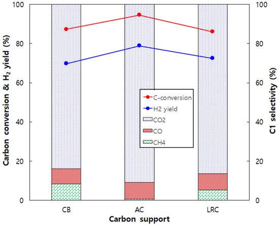 Steam reforming catalysts were prepared on three different carbon supports: CB, AC, and LRC. As shown in Table 1, proven Ni (15 wt%) was used as an active metal, and Mg (3 wt%) as a promoter. Both were uniformly dispersed on the carbon supports [36]. The catalytic activities of NiMg/CB, NiMg/AC, and NiMg/LRC were evaluated for the steam reforming of 30 g/Nm3 toluene at 500 °C with S/C = 6 and GHSV = 15,000 h−1. As shown in Figure 1, the AC-supported catalyst exhibited the highest carbon conversion (95%) and H2 yield (79%). The performances of NiMg/CB and NiMg/LRC were similar, with both showing approximately 87% carbon conversion and around 70% H2 yield. The relative amounts of C1 gases (CO, CH4, and CO2) varied depending on the type of support. The AC catalyst produced approximately 8.5% CO, less than 1% CH4, and about 91% CO2, whereas the CB and LRC catalysts each produced around 8% CO, 5–8% CH4, and 84–86% CO2. This difference suggests that the hydrogenation reaction of CO (Equation (4)) may be influenced by the type of carbon support.