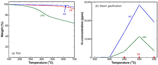 The chemical stability of each carbon support (CB, AC, and LRC) was evaluated at 350–550 °C. Under the same conditions and apparatus as steam reforming, the product gases were monitored with steam as the sole feedstock, with no toluene introduced. The temperature was initially set to 350 °C and increased in 50 °C increments. At each temperature step, the reaction was maintained for 30 min, while monitoring H2 concentrations.