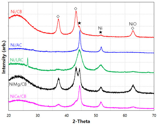 As shown in Table 3, the total surface area (SBET) of the samples ranged from 381 to 903 m2/g. The loading of Ni and the promoters reduced the SBET value by more than 40% compared to raw CB (1534 m2/g), primarily due to pore blockage from the dispersed metals. A large specific surface area is generally advantageous for metal dispersion, providing better catalytic activity [48]. In addition, the percentage of surface area covered by mesopores decreased in all of the samples, from about 82% in raw CB to about 72% for NiMg/CB, 66% for NiCe/CB, 55% for NiLa/CB, and 81% for NiK/CB. Mesoporous supports are known to enhance reactant diffusion and adsorption, thereby increasing catalytic reactivity [49,50]. Total pore volume (Vtotal) also decreased to 0.54–1.01 m2/g, compared to that of raw CB (1.87 m2/g). Average pore size showed similar values to that of raw CB (3.7–7.5 nm).