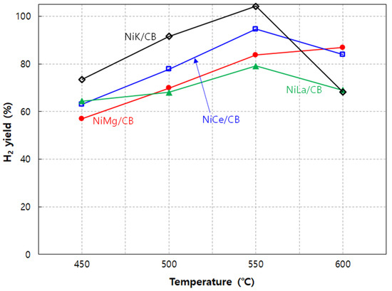 The effects of promoters (Mg, Ce, La, and K) on the Ni/CB catalyst were comparatively evaluated in the 450–600 °C range (Figure 4). Catalytic activity was measured at S/C = 6 and GHSV = 15,000 h−1, with the temperature increasing from 450 °C to 600 °C in 50 °C intervals. All catalysts showed an increase in H2 yield with increasing temperature from 450 to 550 °C. Among these, NiK/CB showed the highest H2 yield, followed by NiCe/CB, NiMg/CB, and NiLa/CB. The addition of promoters enhanced the catalytic ability to cleave C–C and C–H bonds, thereby improving reactivity [43]. The relatively high H2 yield of NiCe/CB was likely due to the enhanced water–gas shift reaction promoted by Ce (Equation (2)) [44]. However, the activities of all of the catalysts, except NiMg/CB, decreased significantly with a further temperature increase to 600 °C. In particular, NiK/CB exhibited a much lower H2 yield at 600 °C (~68%) compared to 450 °C. Increasing reactivity with temperature was expected, as steam reforming is an endothermic reaction. NiCe/CB and NiK/CB exhibited carbon conversion greater than 100% at 550 °C (125% for NiCe/CB and 133% for NiK/CB). This was likely due to the reaction of the CB support with steam, which might reduce the number of active sites by causing the agglomeration of metals dispersed on the support [45]. On the other hand, NiMg/CB exhibited lower activity than NiCe/CB and NiK/CB at temperatures below 550 °C, but showed no decrease in activity at 600 °C. The dispersed promoters, along with Ni, appeared to activate the steam gasification of CB, with the extent of activation varying depending on the type of dispersed metal, since no gasification of raw CB was observed up to 550°C during the reaction with steam. (Figure 2b). It is well known that the steam gasification of carbon materials is enhanced by K, which, in turn, increases H2 production [46,47]. According to the thermal stability behavior observed in Figure 2b and Figure 4, CB-supported catalysts should be used at relatively low temperatures (<500 °C).