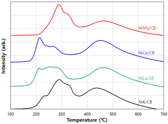 H2-TPR was carried out to investigate the reducibility of nickel with promoters. The prepared catalysts consumed considerable amounts of H2 between 250 °C and 600 °C. As shown in Figure 5, three reduction peaks appeared in NiMg/CB, with maxima at 290 °C, 321 °C, and 468 °C. The first and second peaks were probably due to surface NiOx or NiOx sitting on highly defected CB regions [31,51]. The third broad peak, with a maximum at 468 °C, seemingly corresponded to well-dispersed NiOx particles deposited on the support in various environments [52]. Graphitic carbon in CB might donate a π-electron to neighboring NiOx, facilitating the reduction of NiOx to Ni [41]. When the other promoters (Ce, La, and K) were loaded, their TPR profiles generally resembled that of NiMg/CB, showing 2–3 relatively sharp overlapping peaks below 350 °C, followed by a broad peak with a maximum around 450 °C. The Ce-promoted catalyst showed a reduction peak with a maximum at a lower temperature (210 °C). This observation was consistent with the XRD pattern, which revealed a higher ratio of metallic Ni for the Ce-promoted sample compared to the Mg-promoted one (Figure 3). NiK/CB showed a similar TPR profile to NiMg/CB. However, a reduction peak appeared at a lower temperature (230 °C) in addition to a doublet near 300 °C, suggesting that K provided a more diverse dispersion of Ni compared to the Mg promoter. The promoters generally shifted the Ni reduction peaks to lower temperatures by modifying the bonding between CB and Ni, which can enhance the activation of the toluene steam reforming reaction [53,54]. Ce and La have strong oxygen storage capacities, providing oxygen transfer pathways and, thus, facilitating the reduction of nickel oxides. This resulted in a shift of the reduction peak to lower temperatures compared to NiMg/CB.