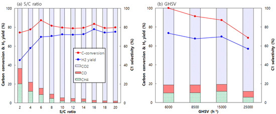 The steam reforming of toluene using NiMg/CB was carried out at 500 °C, with variations in the steam to carbon ratio (S/C = 2–20) and gas hourly space velocity (GHSV = 6000–25,000 h−1). Figure 6a shows the effect of S/C with GHSV = 15,000 h−1. Increasing S/C resulted in a relatively steep increase in H2 yield in the low S/C range (2–6). The H2 yield increased, from 45% at S/C = 2 to approximately 70% at S/C = 6. However, when S/C was increased from 8 to 20, the H2 yield showed a modest increase, from 71% to 78%. The general trends in carbon conversion and H2 yield with changes in S/C were similar. However, carbon conversion did not show any systematic change when increasing S/C from 8 to 20, remaining steady at 79–83%. This was likely due to excessive steam, which not only wastes energy, but also inhibits the steam reforming reaction by saturating the catalyst surface with steam, thereby obstructing the catalytic process [55].