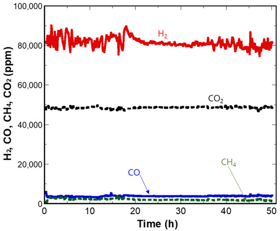 The long-term stability of NiMg/CB catalysts was evaluated during a 50 h continuous run of toluene (30 g/Nm3) steam reforming at 500 °C, S/C = 6, and GHSV = 15,000 h−1. Figure 7 shows the product concentrations over the course of the 50 h reaction. The steam reforming process produced approximately 82,000 ppm H2, 3800 ppm CO, 2100 ppm CH4, and 49,000 ppm CO2, with no sign of production decline throughout the 50 h continuous run. The relative ratio of C1 gases was approximately 7% CO, 4% CH4, and 89% CO2, and this ratio remained consistently similar throughout the 50 h run, indicating no deactivation associated with either toluene steam reforming (Equation (1)) or water–gas shift reactions (Equation (2)).