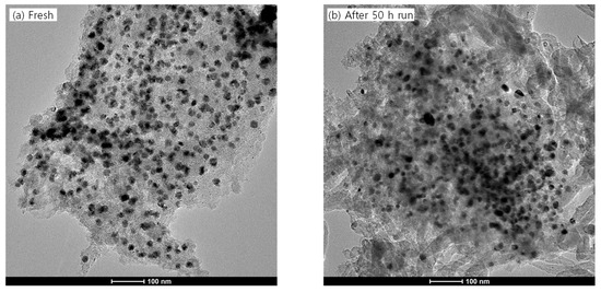 TEM images of (a) fresh NiMg/CB and (b) NiMg/CB after 50 h continuous run.
