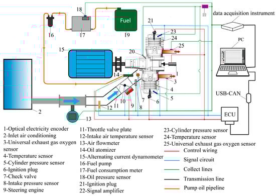 This research was carried out on an engine measurement and control platform composed of the following parts: an intake temperature control system, signal acquisition system, exhaust condensation system, dynamometer, and engine. Figure 1 illustrates the layout of the test bench. The aviation kerosene details are shown in Table 1, the engine parameters are provided in Table 2, and the signal acquisition equipment and specifications are shown in Table 3.
