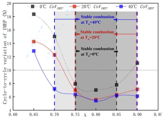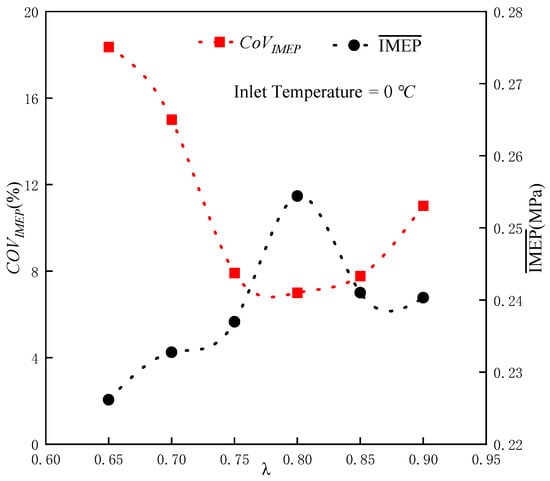 where is the mean value of the combustion state parameter IMEP of cycles; is the deviation of IMEP, which is the combustion characteristic quantity of cycles; is the IMEP for each cycle; and is the number of samples. When studying combustion stability, is generally used as the stable combustion boundary [25]. This study aims to clarify the stable combustion range at various inlet temperatures. When the actual measured , the corresponding excess air coefficient is used as the judgment boundary of the stable combustion range.
