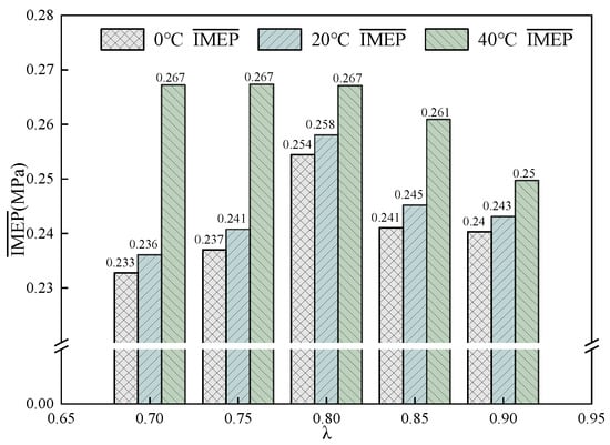 The average IMEP values at intake temperatures of 0 °C, 20 °C, and 40 °C.