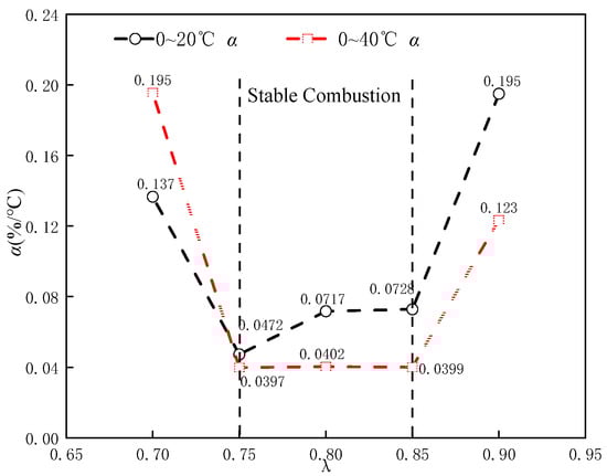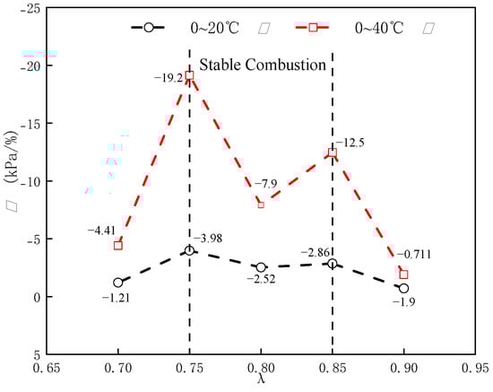 Figure 6 depicts the relationship between and . The results show that, compared with the high , increasing has a greater effect on reducing in this intake temperature range. As shown in Figure 6, 0.90~0.75, and is smaller in the range of 0~40 °C compared to the range of 0~20 °C. At the same time, it was found that, compared with stable combustion, an increase in has a greater effect on reducing in unstable combustion. As shown in Figure 6, is much smaller in stable combustion than in unstable combustion.