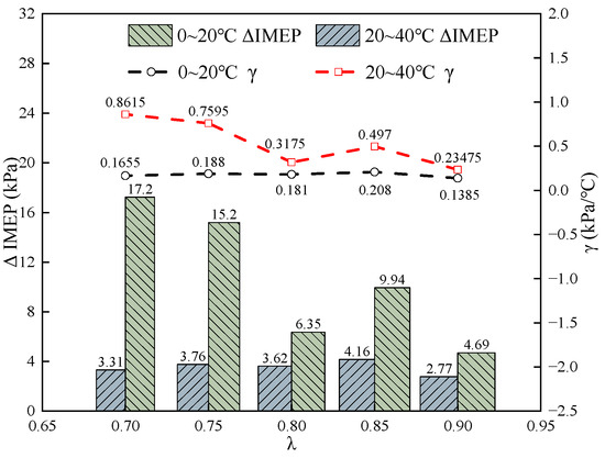 Figure 8 presents the impact of on output work. It can be seen from the figure that an increase in has a positive effect on the improvement of the engine output work, and the influence degree is different in different temperature ranges. When is increased from 0 °C to 20 °C, is approximately 0.13~0.21 kPa. When rises from 20 °C to 40 °C, increases significantly, reaching 0.23~0.86 kPa. This indicates that an increase in temperature has a more significant effect on the IMEP at higher .