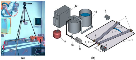 (a) Photo of experimental equipment; (b) schematic diagram of the experimental facility: (1) top and bottom glass plates; (2) side walls of the channel; (3) clamp fasteners; (4) flame front; (5) spark electrodes; (6) ignition coil; (7) inlet nozzle; (8) mixture supply hose; (9) gas volume meter; (10) valve; (11) methane gas tank; (12) hydrogen generator; (13) two-tank displacement gas meter; (14) high-speed video camera.