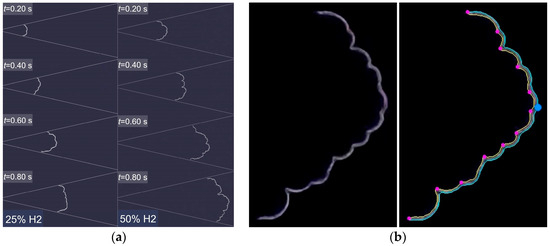 It must be noted that in our recent experiments [39] performed for the stoichiometric methane–air mixture (with no hydrogen added, ) in the channels of the same geometry, but with variable gap width, oscillations only appeared in the channels with a wider gap width, exceeding 5 mm. For a gap width of 3.5 mm (used in the current paper), no flame oscillations were observed for methane–air mixtures. Evidently, faster propagating flames are more prone to these auto-induced oscillations. In the following sections, quantitative analysis of the flame propagation characteristics is performed.