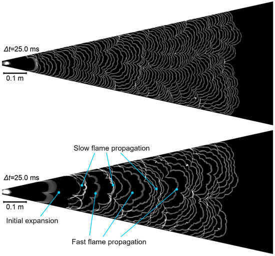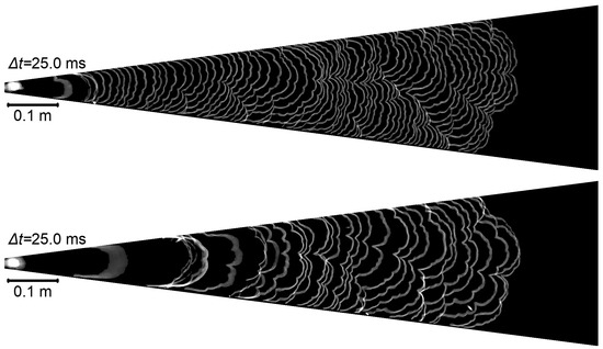 It can be seen in Figure 3, Figure 4 and Figure 5 that higher hydrogen contents in the mixture (bottom plates in each figure) increase the flame speed, which is consistent with the increase in the normal flame speed. According to different authors [11,12,13,14,15,16,17,18,19,20], the addition of 25% hydrogen increases the normal flame speed to some 45 cm/s from 37 cm/s for stoichiometric methane–air flame speed, and with the addition of 50%, hydrogen further increases in the normal flame speed of up to some 60 cm/s (a more detailed comparison of flame speeds will be carried out in the following sections).