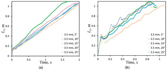By processing each frame of video recordings as described in Section 2.2, the visible history of flame propagation in channels with different opening angles can be obtained. In Figure 6, the leading point longitudinal coordinate (measured from the ignition source position) is presented for all the experiments performed. The figures clearly demonstrate that two main stages of flame propagation are observed. Following the ignition, rapid gas expansion occurs, pushing the flame along the channel. At this initial expansion stage, gas cooling does not play any role because the time for heat exchange is too short. However, with the increase in the heat exchange area, the cooling becomes noticeable, the products are cooling down, and gas shrinkage behind the flame causes deceleration and stoppage of the outward gas flow, reflected by deceleration of the flame. The second stage of flame propagation in the channel is featured by significantly lower visible velocity, and nearly linear flame coordinate growth with time.