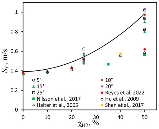 Dependence of the average visible flame speed on the hydrogen contents in the fuel . Data from Nilsson et al., 2017 [17], Halter et al., 2005 [15], Reyes et al., 2022 [18], Hu et al., 2009 [11], and Shen et al., 2017 [16] are shown by dots.