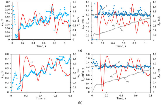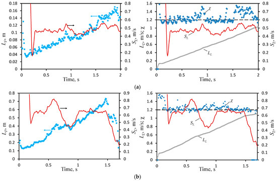 The flame property data obtained for different hydrogen contents are plotted in Figure 8 (25% H2) and Figure 9 (50% H2). In each figure, results are presented for the smallest and largest channel opening angles, 5° and 25°. In the left graphs, the actual flame length is plotted by dots, while in the right graphs, the flame leading point coordinate is shown together with the ratio of the actual and polyline flame lengths . Also, on both graphs, the visible flame speed is plotted by the solid line, allowing one to match the changes in flame properties with its steady propagation or oscillations.