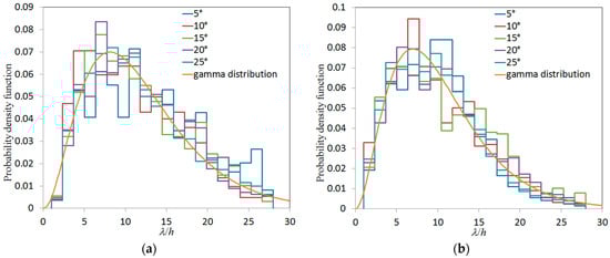 Experimental probability density functions for the cell size on the flame front and their approximation by gamma distribution: (a) hydrogen contents in the fuel ; (b) hydrogen contents .